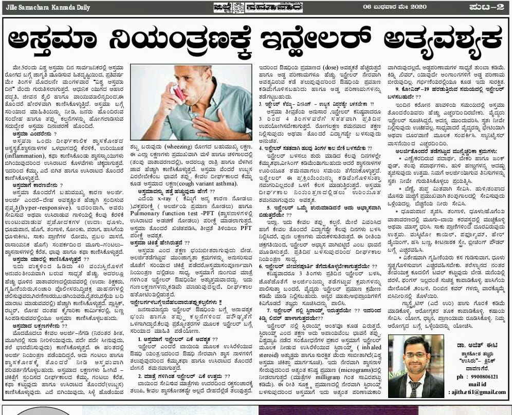 Inhaler is essential for asthma management. Newspaper article in Kannada. Author: Dr. Ajith Eti.